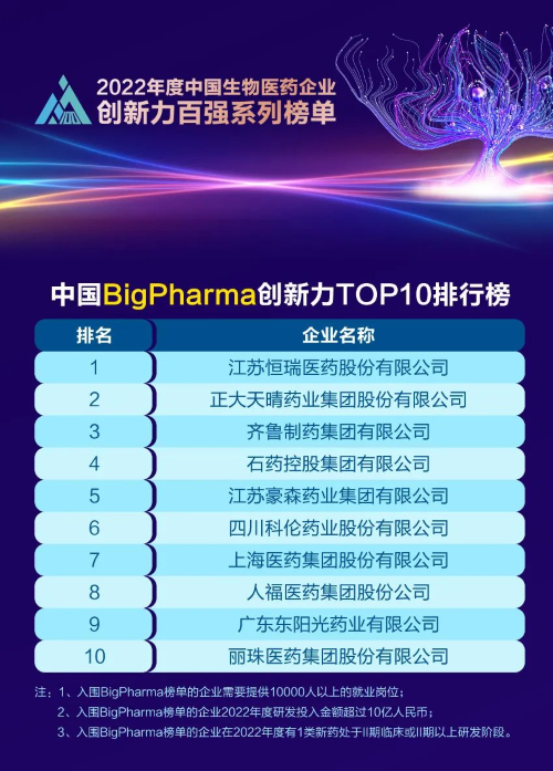 同日,2023米思会(中国医药健康产业共生大会)发布“2022年度中国生物医药企业创新力百强系列榜单”,AG百家乐医药再蝉联“中国BigPharma创新力TOP10”榜首。该榜单自2021年启动评选以来,AG百家乐医药稳居榜首。